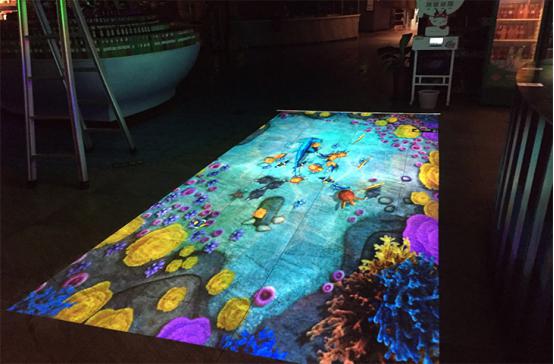 例如火米互動所做的地面魚水互動投影,當人走在地面上時,水面會出現(xiàn)波紋,水中的魚碰到人的腳時會被“嚇跑”。可以吸引客源,讓人在路過的時候直接被這樣一種地面互動投影所吸引。在商場和餐廳中目前使用這項地面互動的比較多,能夠快速的吸引人群的注意力。